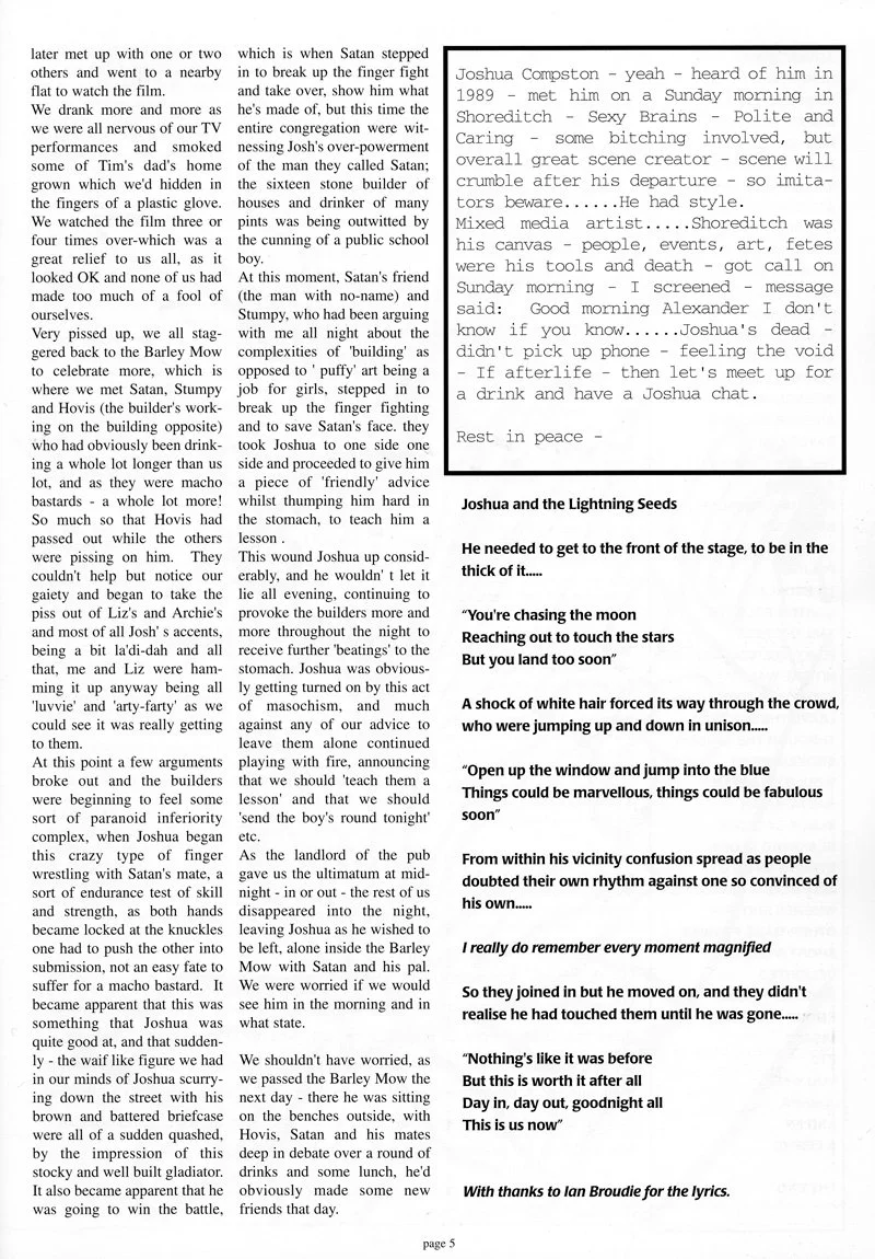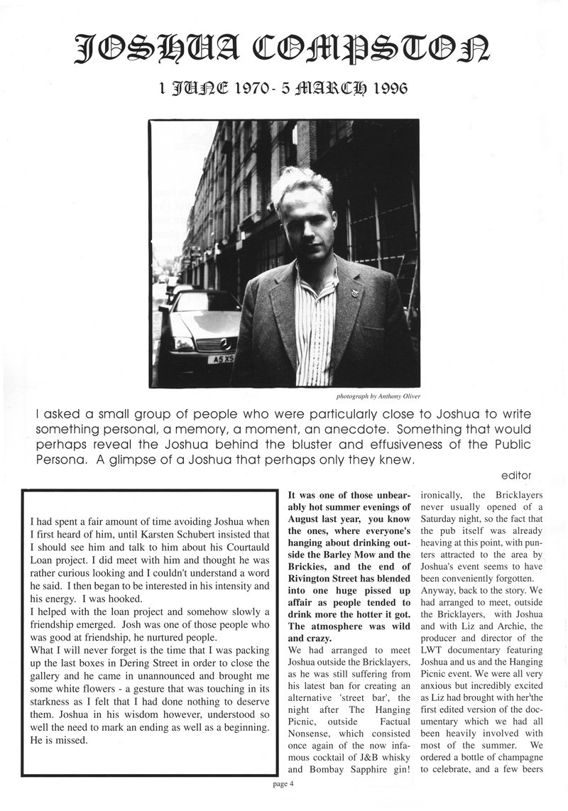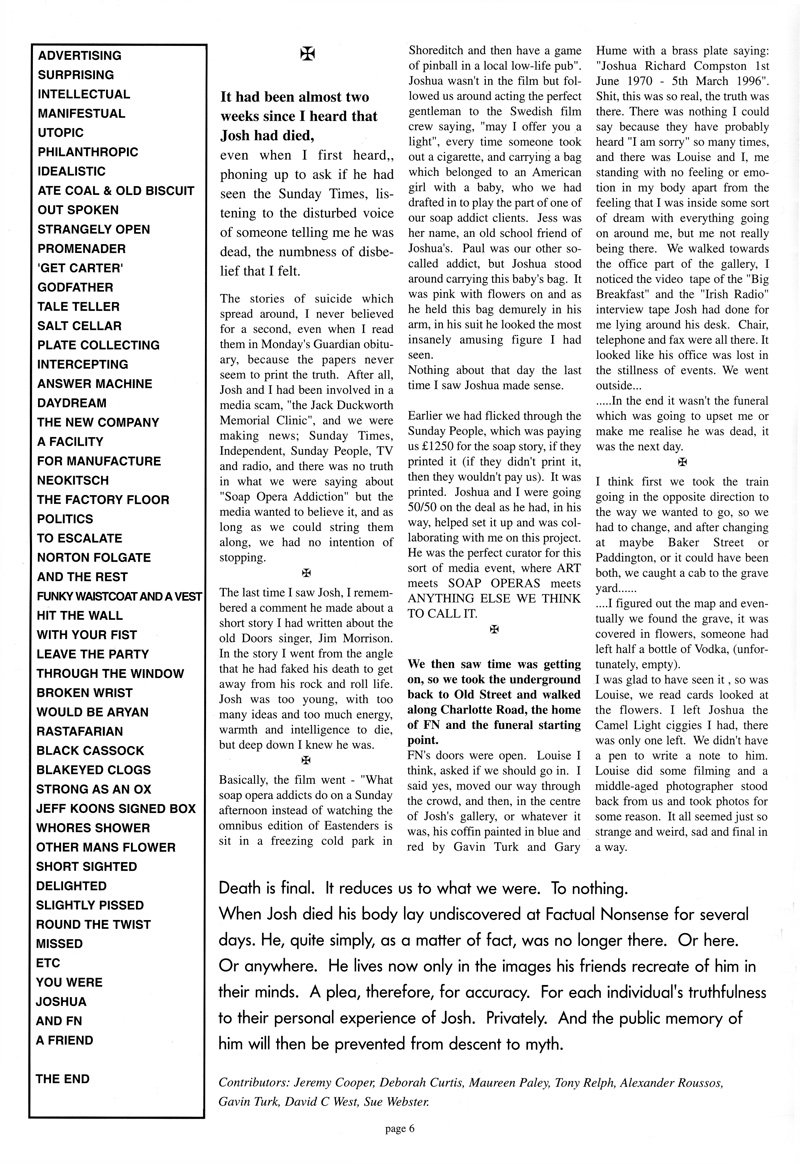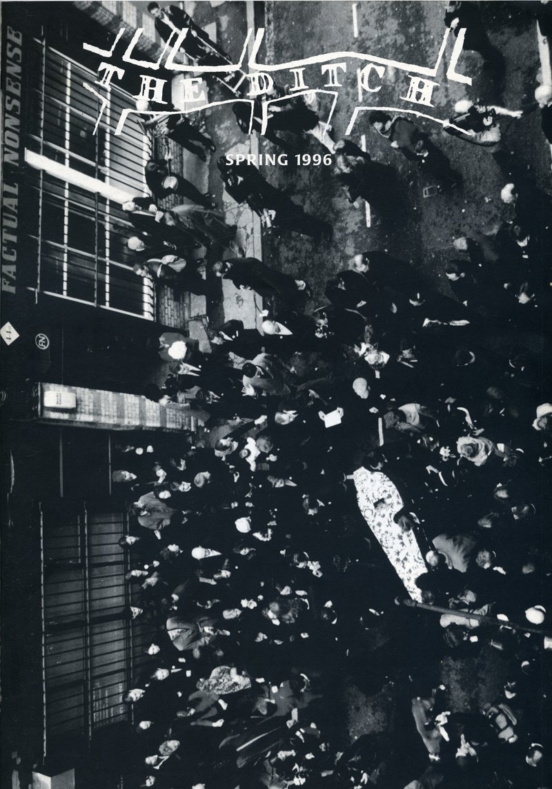 The Ditch | Issue 2 | Spring 1996Joshua Compston funeral and obituary issue Gary Hume | drawing Joshua Compston | eulogiescontributors: Jeremy CooperDeborah CurtisMaureen PaleyTony RelphAlexander RoussosGavin TurkDavid C WestSue Webster Seamus Conlan | Rwandan Funeral Mask centrefold | Charle Wright aka Mr John Nashphotography | Anthony Oliver Hamish Patel | artist statement Link & Daryll | collage ‘perfume and a pint’